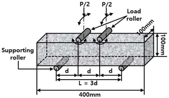 The compressive strength and splitting tensile strength of concrete are considered as the most important parameters. Flexural strength on the other hand is of relatively low importance, but a critical factor that can predict the load that can lead to defects such as the start of cracks []. Fibers added during the mixing process of concrete are randomly dispersed while being meshed and entangled around the aggregate. Through this process, fiber-reinforced concrete has a high tensile strength compared to plain concrete []. This test was conducted to evaluate the flexural strength of concrete added with waste fibers, and it was conducted according to KS F 2408 “Standard test method for flexural strength of concrete” []. The prismatic specimens of 100 × 100 × 400 mm wet cured during the designed age were used. The specimen was placed on equipment of the same model as the compressive strength equipped with the jig for measuring flexural strength, and the load was applied at a rate of 0.06 ± 0.04 MPa/s until the specimen was destroyed by applying the three-element loading method as shown in Figure 5.