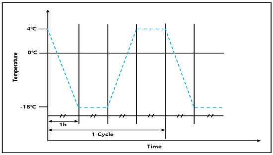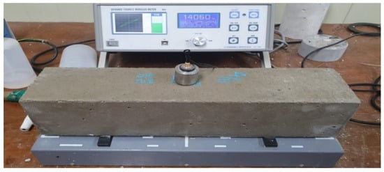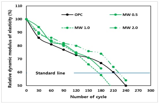Concrete is a porous and brittle material, and defects may occur due to reduced strength or crumbling when constructed in a site where freezing and thawing environments are repeated, such as in a cold area []. In particular, when water absorbed into the concrete structure is frozen by the surrounding environment, volume expansion occurs, and there is a larger space for moisture to move into the concrete. After then, as the freezing and thawing process repeatedly occurs, the deterioration of concrete accelerates, significantly reducing overall durability such as penetration resistance of chlorine ions and harmful substances. Therefore, evaluating the freezing–thawing resistance of concrete is one of the parameters to evaluate the durability of concrete during the service life. This experiment was performed to evaluate whether the addition of waste fibers to concrete had an effect on the freezing–thawing resistance. The experiment was conducted according to ASTM C 666 “Standard Test Method for Resistance of Concrete to Rapid Freezing and Thawing” []. After the specimens in the form of a prism of 100 × 100 × 400 mm at the age of 14 days was placed in the equipment, the specimens were subjected to freezing–thawing in one cycle of 4 h in the temperature range of −18 °C to 4 °C as shown in Figure 6. The evaluation was conducted through visual rating and weight retention ratio every 30 cycles, and the reduction ratio of the relative dynamic modulus of elasticity was reviewed. The dynamic elasticity modulus of elasticity was measured using the equipment as shown in Figure 7. The test was conducted until the relative dynamic modulus of elasticity ratio was reduced to 60% or less or until the freezing–thawing action reached 300 cycles as specified in ASTM C666.