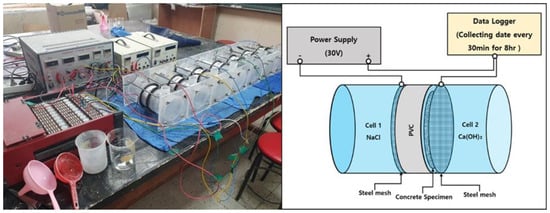 The penetration of foreign substances inside concrete is mainly affected by the fine pore structure of concrete, construction site, curing time, etc. []. Materials such as water, chloride, and acid can reduce durability and strength when penetrating into concrete []. Among the above materials, chlorine ions not only adversely affect the internal matrix of concrete, but also induce corrosion rebar when contacting reinforced concrete, and when combined with freezing and thawing, the problem of durability accelerates. According to a related research case, fibers added to concrete can alter several physical properties of concrete, including voids and permeability []. The diameter of harmful pores defined by researchers varies, but in general, the pore structure inside concrete is known to directly affect the penetration of ions or moisture. The chloride ion penetration test was conducted according to ASTM C 1202 “Electrical Indication of Concrete’s Ability to Resistance Chloride Ion Penetration” [] to evaluate the resistance to chloride ion penetration of concrete reinforced with waste fibers. A side surface of specimens at the age of 28 days was coated with epoxy, cut to a thickness of 50 mm, and ion diffusion cells were attached to both ends thereof, and each cell was filled with calcium chloride solution and calcium hydroxide solution, and then a voltage of 30 V was energized for 8 h. Figure 8 shows the experiment foreground and schematic diagrams of the experiment, respectively. The current flowing through the specimens were collected through a data logger at 30 min intervals, and the passing charge amount for each specimen was calculated, and the evaluation was performed according to the criteria specified in ASTM C 1202 as shown in Table 4.