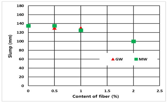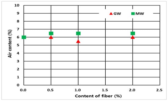 Slump is a property that is directly related to the workability of concrete and affects the compactibility and pumpability of the mixture. Therefore, excessive compression energy may be required when placing concrete mixtures that do not satisfy the designed slump, which may induce material separation of concrete, resulting in a decrease in strength and durability. As the addition rate of fibers in concrete increases, the viscosity of the mixture increases and the slump decreases []. Therefore, it can be said that fiber-reinforced concrete shows a different slump behavior from ordinary concrete, and as the fiber addition rate increases, measures such as increasing the unit water or increasing the use of water reducer are applied to satisfy the design slump. This test was conducted for the purpose of evaluating flow properties of fresh concrete according to the type and addition rate of waste fiber wool by KS F 2402. The air content of concrete has a great influence on durability such as freezing–thawing resistance as well as strength. If the air content is excessively dispersed in concrete, the strength of the concrete will decrease significantly, making it difficult to meet the strength standards, and it may also have a negative impact on durability. Thus, when concrete is placed in the cold region, an air entraining agent is added to most concrete to ensure freezing–thawing resistance []. It is commonly known that the freezing–thawing resistance of concrete is the best at the air content within 6% []. The air content is a measure to evaluate durability of concrete when it is not hardened. This test was conducted to examine the change in air content when waste glass wool and mineral wool were added to the concrete. The test method was conducted according to KS F 2421.