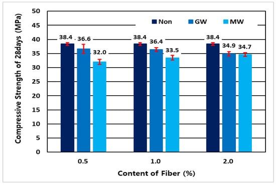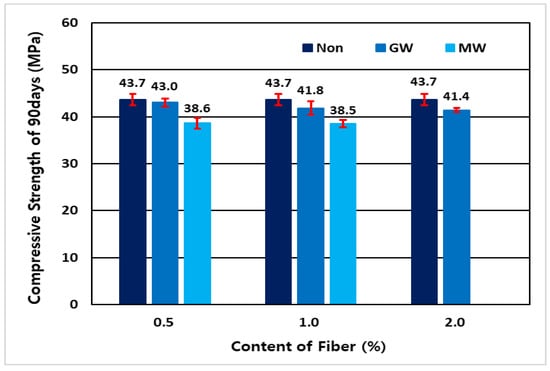 Concrete is known as a material with excellent compressive strength, which can be used as the most representative structural material. Various fiber reinforcement materials (polymer fiber, steel fiber, glass fiber, etc.) are applied to reinforce concrete generally and improve the bending strength of mortar, but it is known that the compressive strength decreases at different rate depending on the type of fiber and addition rate [,]. However, there are a some studies in the case of fiber-reinforced concrete that differ in regard to the decrease in compressive strength. Kaushik’s study shows that the compressive strength increases when 20 to 30 percent of cement was substituted by fly ash and glass and steel fiber were added to concrete []. The compressive strength test was conducted to evaluate the change in compressive strength that may occur when fibers are added, the test was conducted according to KS F 2405 “Test method for compressive strength of concrete” []. The wet curing was performed on a manufactured cylindrical specimen with diameter of 100 × 200 mm, for 28 days and 90 days. After curing time of designed age, the surface of specimens were polished to prevent eccentric load and placed on a uniaxial compression test equipment. Then compression load was applied until the specimen was destroyed at a speed of 0.6 ± 0.4 MPa to measure the compressive strength.
