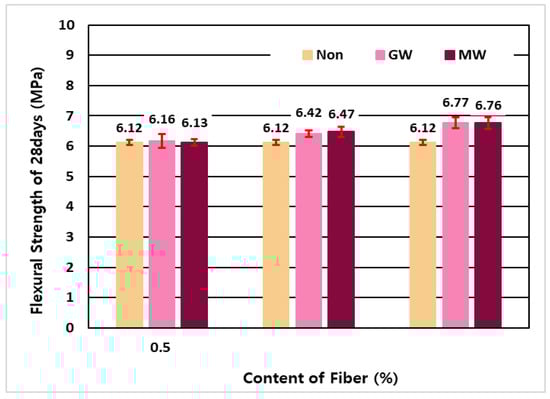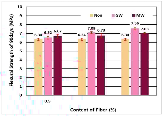 In general, the flexural strength of concrete is known to be very low, approximately less than 10%, compared to the compressive strength, and for this reason, the propagation of cracks under flexural load is very fast. So, controlling cracks due to such flexural load may play an important role in the durability life of concrete []. Reinforcement of concrete through fibers can increase the flexural capacity of concrete and reduce the generation of tensile cracks []. This experiment was conducted to evaluate the effect of improving the flexural strength of concrete through the addition of waste glass wool and waste mineral wool. The results of measuring the flexural strength of concrete according to the waste fiber wool addition rate are shown in Figure 13 and Figure 14. As shown in Figure 13, flexural strength at 28 days for the reference concrete was 6.12 MPa and for the specimen with the addition rate of 0.5% of waste glass wool and mineral wool was 6.16 and 6.13 MPa, respectively, so it was confirmed that the improvement effect on the flexural strength was not significant at the addition rate of 0.5%. However, at the addition rate of 1.0% or more, it was found that the flexural strength was 6.42 MPa (waste glass wool) and 6.47 MPa (waste mineral wool), and when the addition rate was increased to 2.0%, the strength increase was 6.77 MPa (waste glass wool) and 6.76 MPa (waste mineral wool), about an 11% increase. Similarly, as shown in Figure 14, the strength of the reference concrete was 6.34 MPa at 90 days, and in concrete with 0.5% addition rate of waste glass wool and mineral wool, it was 6.52 and 6.67 MPa, respectively, and no significant improvement effect was confirmed. This means that the appropriate addition rate of the waste fiber wool for the flexural strength improvement effect is 0.5% or more, and at the addition rate of 1.0%, it is 7.09 MPa (waste glass wool) and 6.73 MPa (waste mineral wool), respectively, which shows a clear strength improvement effect compared to the reference concrete. In addition, when the addition rate is increased to 2.0%, it is 7.56 and 7.03 MPa, which have a strength improvement effect of 19 and 11%, respectively, compared to the reference concrete. In particular, waste glass wool was found to have the highest strength increase between 28 and 90 days at a 2.0% addition rate, and at the addition rate of 1.0% or more, it was confirmed that the effect of improving flexural strength was more pronounced than that of waste mineral wool. This effect of improving flexural strength is considered possible because fiber strands dispersed in concrete form a 3D network structure to support a part of flexural load and performed a role of a bridge until destruction by flexural load.