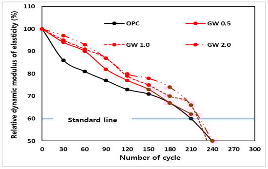 Concrete is a structural material constructed under various environments and is directly exposed to various environmental conditions such as rainfall, heat waves, and snowfall. In particular, in the case of a cold region, a phenomenon in which moisture due to rainfall penetrates into the concrete and freezes may occur. At this time, moisture inside the concrete is frozen and expands to about 9%, and accordingly, expansion pressure is applied to the concrete []. Continuous application of expansion pressure to concrete can cause cracks and, in severe cases, lead to defects such as destruction of concrete. Various types of fibers, such as steel fiber, artificial fiber, and glass fiber, are widely used as reinforcing materials that can be an alternative to securing durability such as freezing–thawing resistance of concrete through many research cases []. This experiment was conducted to evaluate whether the freezing–thawing resistance, one of parameter of concrete durability evaluation, can be improved by the addition of waste fiber wool. Figure 15 and Figure 16 show the results of the measurement of relative dynamic modulus of elasticity by cycle of freezing–thawing according to the addition rate of waste glass wool and waste mineral wool. Most of the waste glass wool-added specimens in Figure 15 showed high resistance to freezing–thawing compared to reference concrete. For reference concrete, the relative modulus of elasticity dropped below 60% in 210 cycles, while in waste glass wool-added specimens subjected to the same cycle, it was found to be 62 (0.5%), 66 (1.0%), and 66% (2.0%), respectively. It was confirmed that the addition of waste glass wool affects the improvement of the freezing–thawing resistance of concrete, and this effect is because the waste glass wool dispersed in concrete shares the expansion pressure with freezing pressure to delay the generation of cracks and prevent the cement paste from being separated. Figure 16 is the result of measuring the relative modulus of elasticity for the waste mineral wool-added specimens, and it was found that the relative modulus of elasticity was higher up to the initial 120 cycles compared to the reference concrete. However, after 150 cycles, specimens with 0.5% and 1.0% added waste mineral wool decreased sharply to 71 (0.5%) and 66% (1.0%), respectively, particularly in specimens with 0.5% added waste mineral wool that were destroyed in 180 cycles as it can be shown in the Figure 16. The 1.0% addition specimen showed a relative modulus of elasticity of 58% in the same cycles, which did not meet the criteria. When 210 cycles of freezing–thawing were applied, the relative dynamic modulus of elasticity of reference concrete fell below the criterion, but the 2.0% waste mineral wool-added specimen maintained above the criterion at 64%, and it was confirmed that it fell below the standard in 240 cycles to 54%. This means that in the case of waste mineral wool, unlike waste glass wool, the appropriate fiber addition rate required to improve the durability in terms of freezing–thawing resistance is high.