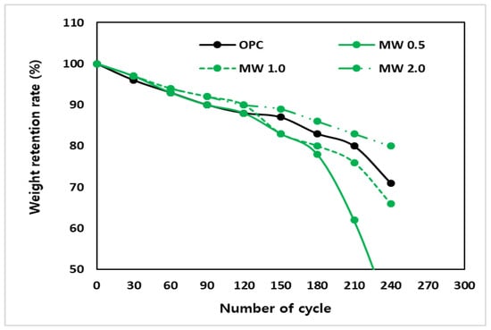 Figure 17 and Figure 18 shows the weight retention rate of specimens to the application of freezing–thawing cycles by type of waste fiber and addition rate. As a result of the measurement, it showed a similar tendency to the result of the relative dynamic modulus of elasticity. Until the initial 150 cycles, both specimens to which two types of waste fiber wool are added had a weight loss due to freezing–thawing less than reference concrete, but after 150 cycles, the weight retention rate was decreased sharply in specimens with low addition rate of waste fibers. In the case of waste mineral wool, like the relative dynamic modulus of elasticity, the weight retention rate was 83% in the specimen to which 1.0% was added which was 4% lower than 87% of the reference concrete. These results represent that the addition of waste fiber wool can improve the freezing–thawing resistance, but the appropriate addition rate varies depending on type of waste fiber wool, and at a low addition rate of 1.0%, it cannot be expected to improve the freezing–thawing resistance through waste mineral wool.