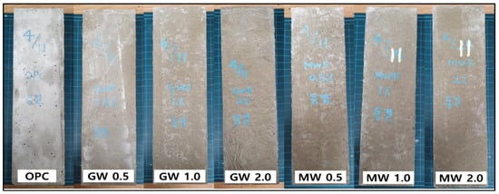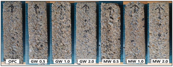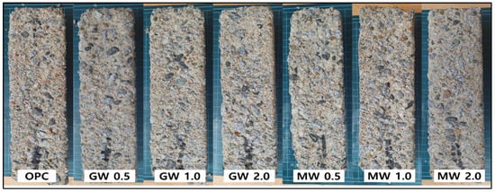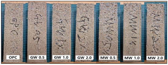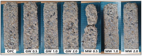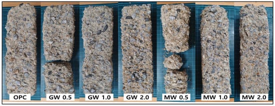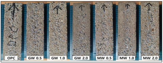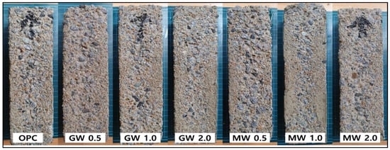 Figure 19, Figure 20, Figure 21, Figure 22, Figure 23, Figure 24, Figure 25, Figure 26 and Figure 27 are photographs taken to perform visual evaluation of each sample every 30 cycles, and little scaling of the surface occurred from the initial 0 to 30 cycles. After 30 cycles, scaling occurred radically and exposing the coarse aggregate to the sample surface, and after 90 cycles, some coarse aggregates fell off. In particular, similar to the results of the weight retention rate in 150 cycles, coarse aggregate raveling occurred remarkably in the 0.5% addition sample of waste glass wool and in 0.5 and 1.0% addition samples of waste mineral wool, and thereafter, coarse aggregate fell off from the corners of all freezing–thawing specimens. In addition, in 210 cycles, the mineral wool 0.5% addition specimen was completely destroyed, and defects were observed in all specimens to the extent that there was a severe shape change compared to initial specimens. As a result, it was confirmed that the improvement on freezing–thawing resistance of concrete added with waste glass wool fiber and waste mineral wool fiber varies slightly depending on the addition rate and type of fiber. This means that the amount of addition required to secure appropriate resistance by freezing pressure in concrete differs because the tensile properties vary depending on the type of waste fiber.