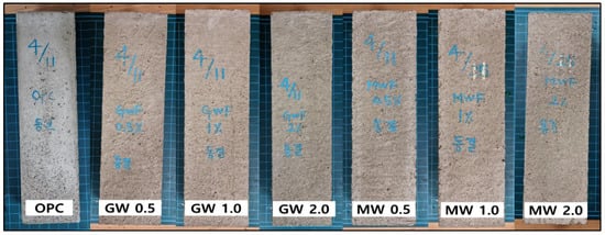 First, fine aggregate and coarse aggregate were mixed for 30 s, and then, waste fiber wool was added and mixed for 30 s. After that, cement was added and mixed for 30 s, and finally, blending water and additives were added, and mixing was carried out for 2 min. After mixing, properties of fresh concrete mixture were evaluated according to KS F 2402 “slump test method of concrete” [] and KS F 2421 “air flow test of concrete” [], respectively. Then, specimens were created in a circular cylinder type of 100 × 100 × 200 mm and a prism type of 100 × 100 × 400. Specimens were cured in the atmosphere by covering a tarpaulin to prevent rapid evaporation of moisture in the atmosphere at 20 °C for 24 h, and after atmospheric curing, the samples were demolded and cured at 20 ± 2 °C in a constant temperature water bath.
