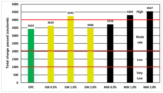 The penetration of chloride into concrete structures can lead to corrosion and reduction in strength of rebar, resulting in early repair of the structure []. Therefore, the chloride ion penetration resistance of concrete is an important factor for evaluating the durability, and in general, the easier it is to penetrate chloride ions, the higher the total charge passed is measured. This experiment was conducted to evaluate the chloride ion penetration resistance of concrete in which waste fiber wool was added. Figure 28 shows a graph depicting the result of deriving the total charge passed by accumulating the charge passed measured in units of 30 min for 8 h on the 28-day specimens. First, the reference concrete was 3423 Coulomb, showing a moderate level of charge passed based on ASTM. The specimen to which waste glass wool was added showed passing charge amounts of 3619, 3582, and 3468 Coulomb with the addition rates of 0.5%, 1.0%, and 2.0% respectively, and it was confirmed that the total charge passed was similar as it showed a difference of up to 6% compared to reference concrete. However, the specimen to which waste mineral wool was added showed total charge passed of 3716, 4304, and 4547 Coulomb by addition rate, and as the addition rate increased, the total charge passed was also increased. When more than 1.0% of waste mineral wool was added, the level of total charge passed was higher than reference concrete, which sharply decreased the chloride ion penetration resistance. In general, when fibers were dispersed in concrete, they reduced the size of the pores in the cement matrix and formed micro pores that increased the density of the internal structure. As a result, it is known that durability may be improved through impermeability. However, if the fiber dispersion in the concrete is uneven or other substances in the fiber were present and mixed together, pores that may inhibit permeability may be formed, thereby deteriorating the concrete pore structure. Therefore, in the case of waste glass wool, there was no improvement in chloride ion penetration resistance through formation of fine pore structures in concrete, but it was expected that it can be applied as a fiber-reinforcing material according to similar permeability to reference concrete. But, specimens to which waste mineral wool was added, the total charge passed increased by up to 33% compared to reference concrete, which means that as the addition rate increased, harmful pores with a size that is easy for chloride ions to penetrate were formed in the cement matrix. Thus, it is considered that the addition of waste mineral wool to concrete cannot be expected to improve the durability aspect such as chloride ion penetration resistance.