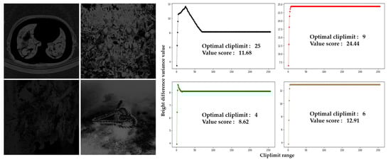 The ‘cliplimit’ optimal value is obtained when the absolute brightness difference between the original image and the simple CLAHE-applied image is calculated. The variance of the pixel values is then calculated in the difference image, and this process is repeated for the cliplimit parameter range (0–255). The maximum variance value is designated as the optimal value.