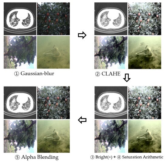 When the optimal value is obtained, the following image generation process is performed: (1) when the original image is input, non-uniform pixel values are evenly adjusted and Gaussian blur processing is performed to mitigate noise; (2) after applying the contrast enhancement technique (CLAHE) to the L (luminosity) channel of the lab channel using the optimal ‘cliplimit’ value, it is converted to the RGB channel again; (3) the brightness is increased according to the optimal ‘α’ value for the contrast-enhanced image; (4) the saturation arithmetic is applied to the contrast-enhanced image to maintain image quality by preventing the brightness or color values of the image data from changing too much; (5) the image is overlaid with the saturation arithmetic by applying alpha blending to the original image.