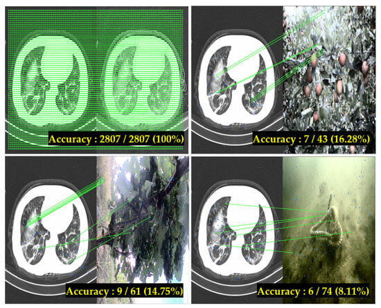 Figure 8 is the feature point matching image obtained using LoFTR. When feature point matching was performed on multiple objects, including the same object, using LoFTR, acciracy was measured using Equation 5 and showed high performance, as shown in the results in Figure 8. The accuracy of feature point matching can be determined by dividing the correctly matched feature points by the number of all matched feature points. In this paper, the optimal image was evaluated based on a matching rate accuracy of 95%.