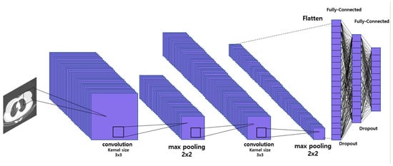A convolutional neural network (CNN) was used as a learning model to classify diseases in the X-ray dataset, and the architecture was constructed as shown in Figure 9 [61].