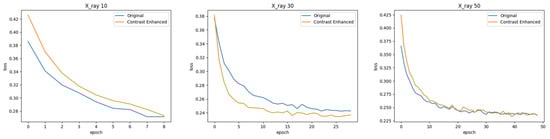Figure 10 shows graph images of the X-ray dataset loss by epoch. Through the graphs, we can see that as the epoch increased, the loss steadily decreased. This means that the model’s performance on the training data gradually improved, overfitting or underfitting problems did not occur, and the training data were sufficient and diverse, enabling the model to express the training data appropriately. This shows that the appropriate learning rate was set. Table 1 shows the accuracy with which the model diagnosed 30,000 test images, which is 20% of the dataset, based on the learned result weights. During the test process, both the original and contrast-enhanced datasets achieved the best performance, and as the epoch increased, the accuracy of the contrast-enhanced dataset improved. Although we achieved over 99% accuracy with 10 epochs, we attempted to secure reliability in accuracy through follow-up training, and the accuracy improved, albeit slightly. Above all, this suggests that when the preprocessing process proposed in this paper is applied to object tasks, performance does not decrease, and the existing performance can at least be maintained and improved.