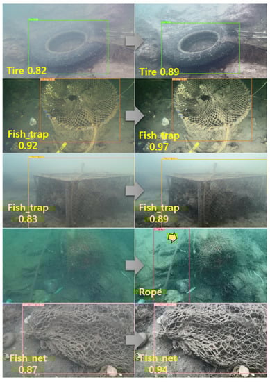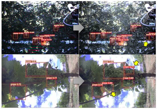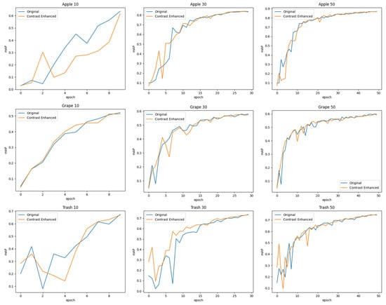 Figure 11 shows that in the case of the grape and marine deposited waste data, the mAP improvement value decreased as the epochs increased. Unlike the apple data, which had a standard round shape, these had an atypical shape, and there were many objects with various shapes, so the mAP improvement tended to be low. As the epochs increased, all three dataset graphs showed mAP values increasing stably, and there was no significant difference in mAP performance between the original and contrast-enhanced dataset.