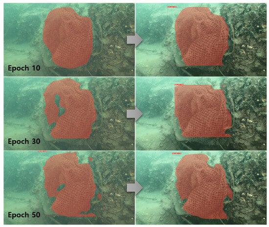 Figure 14, Figure 15 and Figure 16 show images of the instance segmentation results for each object. In Figure 14, you can see that in the case of the apples, while maintaining the existing segmentation performance, the apples in the shadow area, or those that are hidden, are captured, and the mask recognition performance is also increased to enable more accurate size prediction. For the rope and fish nets, which have atypical shapes, object size prediction performance improvements were confirmed in in environments with little light and poor viewing conditions through segmentation for each epoch.