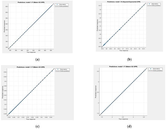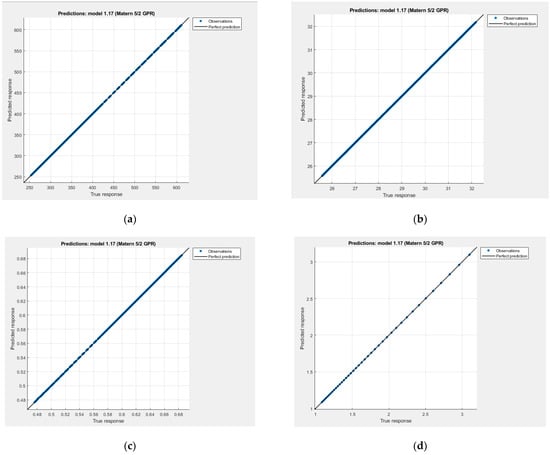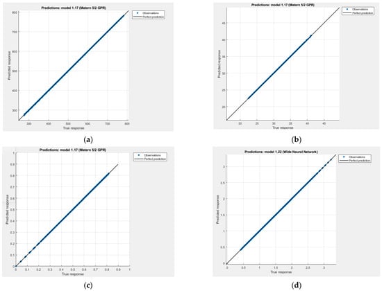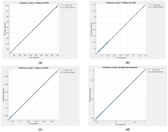 The predicted vs. actual response graphs for each model are shown in Figure 10, Figure 11, Figure 12 and Figure 13. The data points were located close to the unity line, proving that the regression models have successfully predicted the response values. Gaussian process regression and wide neural network models performed better than the rest of the regression models as the RMSE was closer to zero and the predicted values were distributed on the unity line.