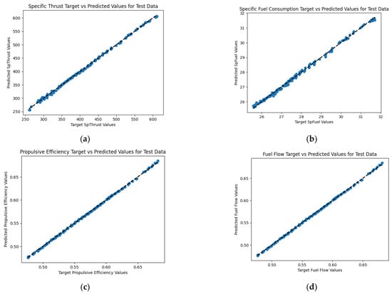 Predicted response vs. actual response plots for (a) specific thrust vs. Mach number and altitude; (b) specific fuel consumption vs. Mach number and altitude; (c) propulsive efficiency vs. Mach number and altitude; and (d) total fuel flow vs. Mach number and altitude.