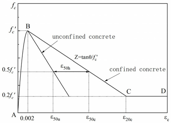 In this study, according to the structural design code of China [29], a model for RC conventional frame structures with five layers, three spans, and five bays is designed. The floor height is 3.3 m. The structural model has a longitudinal span of 7.2 m and a transverse span of 6 m. Component dimensions and reinforcement information are listed in Table 1. Symmetrical three-dimensional building models are established with the OpenSEES program [30]. The Concrete02 material model is selected as the constitutive model of concrete. The model considers the tensile strength of the material and simplifies the tensioned softening branch to a linear curve, which ensures the accuracy of the calculation model and has good convergence along with high computational efficiency. The skeleton curve of the concrete in the constitutive model adopts the modified Kent–Park model [31], as shown in Figure 1. This study selected the Steel02 material model as the constitutive model of reinforcement. The Steel02 material model considers the steel tensile strength, in which the tensile softening branch is simplified as a linear processing. The model considers the effect of material strain hardening, which has been put forward by Menegotto Pinta [32] and modified by Filippou [33]. The material model also considers the Bauschinger effect. Figure 2 shows the Steel02 material monotonic envelope curves. This study used a nonlinear beam column element and fiber section in addition to the torsional section. The symmetrical building model is a three-dimensional numerical model. Each node has six degrees of freedom. The floor slab adopts a three degrees of freedom rigid diaphragm beam in OpenSEES. The floor mass is concentrated at the geometric center of the floor.
