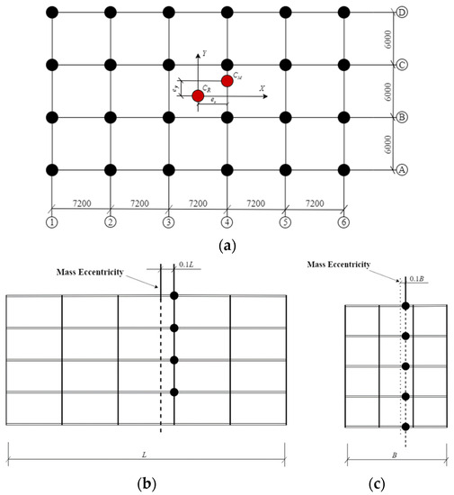In this research, there are uniaxial eccentric structural models and bidirectional eccentric structural models in the dynamic time history analyses. The eccentricities of both types of models are set as 0%, 5%, 10%, 15%, 20%, 25%, and 30% (0% eccentricity corresponds to the symmetric structural model). In the bidirectional eccentric structural models, the eccentricities in the X and Y directions are the same. Figure 3 and Figure 4 show the layouts of the uniaxial eccentric structure and the biaxial eccentric structure.