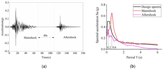 Figure 5b shows the design spectra and acceleration response spectra of the mainshock and aftershock. The design spectra are based on the Chinese seismic design code [29], where the maximum acceleration coefficient is 0.5. The mainshock and aftershock records are scaled to rare earthquake level in degree 7. As shown in Figure 5b, the periods corresponding to maximum spectral acceleration of mainshock and aftershock records are 0.2 s and 0.6 s, respectively.