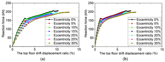 A pushover analysis is applied to the tested eccentric structures in this section. The lateral loads are assigned to the mass center of each floor. The roof displacements and first floor displacements of the eccentric structures of different eccentricities under lateral load are shown in Figure 6a,b, respectively. The resistance force decreases as the eccentricity increases, which means the seismic capacity of the structure is weaker. The structure with 5% eccentricity is an exception. The structure with 0% eccentricity (i.e., a symmetrical structure) has the best seismic capacity, and the structure with 30% eccentricities has the worst seismic capacity.