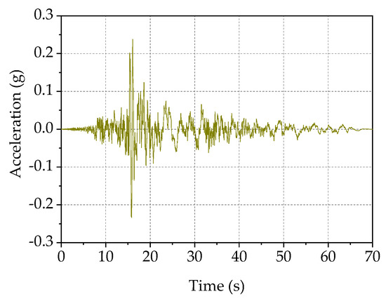 The earthquake ground motions are loaded along two horizontal directions, i.e., the X and Y directions. According to the seismic design code of buildings [34], the ratio of PGA of ground motion loaded in the X direction to that in the Y direction is set as 1:0.85. “CHICHI-CHY029-N” and “CHICHI-CHY029-E” are used to name the ground motions in the X direction and the Y direction, respectively. The PGAs in the X direction and Y direction are 0.238 g and 0.185 g, respectively.