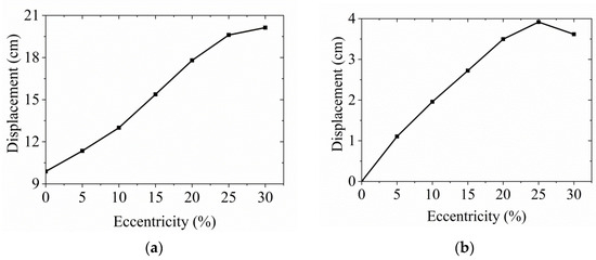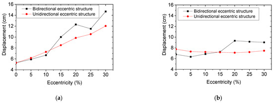 Comparison of top floor displacement of unidirectional eccentric structure and bidirectional eccentric structure with different eccentricities: (a) Top floor displacement in the Y direction; (b) top floor displacement in the X direction.