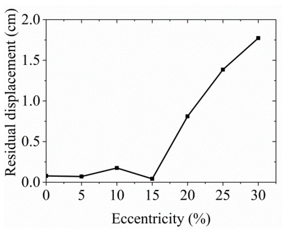 The response results, including maximum displacements in the X and Y directions, the maximum residual displacement, the torsional angle, the relative torsional effect, and the maximum IDR, are extracted and compared. The maximum displacements of structural models in the Y direction under all eccentricities are shown in Figure 8a. It is evident that as eccentricity increases, the structural displacement also increases, and the increasing speed exhibits a pattern of at first rapid and then slow growth. This indicates that the influence of eccentricity on displacement will gradually weaken with an increase in eccentricity. The maximum increase was more than 2.5 times, at 30% eccentricity.