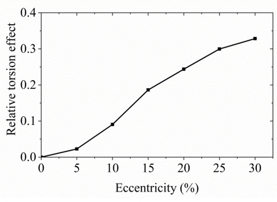 Figure 11 shows the moving trend of relative torsional effect with a change in eccentricity. The relative torsional effect γ is defined as the ratio of the displacement at the radius of rotation from the rigid center to the translational displacement of the floor. It reflects the ratio of the torsional displacement to the translation displacement of the structure due to torsion and is one of the important indexes to measure the torsional effect for eccentric structures. It is calculated by Equation (7):