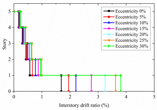 Moreover, the maximum IDRs in the Y direction for symmetrical and eccentric structural models is obtained in the study, as shown in Figure 12. For each model, the largest IDR appears at the bottom layer. With the improvement in eccentricity, the IDR becomes larger and larger for the first floor. This illustrates that the bottom of structures is most influenced by eccentricity, and the maximum IDR is the most sensitive indicator for the increase in eccentricity. Moreover, the maximum IDR is considered to be an intuitive observation indicator of structural deformation in many national codes. It can directly present the structural damage phenomenon in the failure process. This is another justification for choosing the maximum IDR as the scaled criterion indicator in this study, as shown in Table 7.