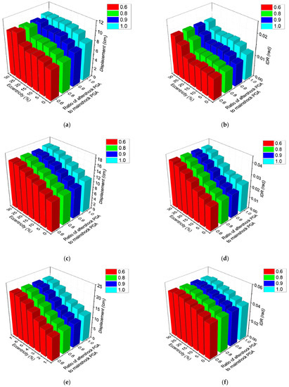 The seismic responses of the bidirectional eccentric structure under bidirectional mainshock–aftershock sequences (case BBS) are further examined through a dynamic analysis. The maximum displacement responses of the structures are presented in Figure 20a,c,e. To investigate the influence of aftershock, the ratios of the maximum displacement under the MSAS sequences to the displacement under the mainshock are also compared, which are shown in Figure 21a,c,e. It can be demonstrated that structures with small eccentricities are more sensitive to aftershocks, and the maximum impact of aftershocks on displacement can reach 1.5 times that of the mainshock (at the mainshock PGA 0.15 g). But, for high PGAs of the mainshock (i.e., 0.25 g and 0.32 g), aftershocks have little impact on the structural displacement. Only for symmetrical structures and structures with small eccentricities, such as 5% eccentric structures, could aftershocks increase the displacement response, but the increase effect is less than 5%.