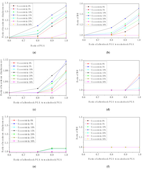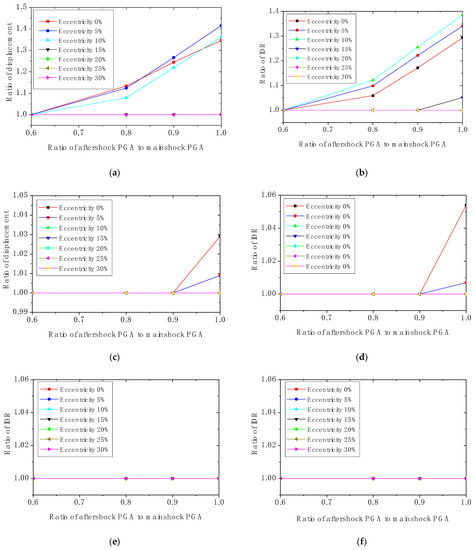 As illustrated in Figure 14a, at the same eccentricity, the ratio of aftershock displacement to mainshock displacement exceeds 1.0 and increases gradually with an increase in aftershock magnitude. It shows that the displacement during the aftershock is larger than that during the mainshock. When the scaling factor of aftershock amplitude is equal to 0.8, the displacement ratios increase significantly, except for the structural models with eccentricities of 25% and 30%. While the scaling factor is 1, the displacement ratios of almost all structures are increased, and the maximum ratio is increased by about 1.4 times. This means that if an aftershock with the same intensity as the mainshock (PGA 0.15 g) is encountered, there is a high probability that the displacement of the eccentric structure during the aftershock will exceed the maximum displacement during the mainshock. In addition, the amplification effect is more prominent in high eccentric structures, up to about 1.4 times more prominent.