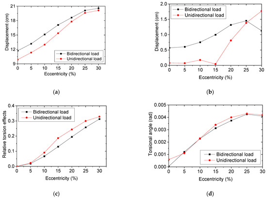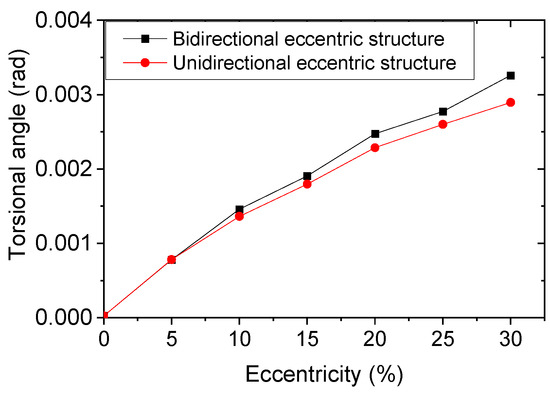 Moreover, the torsional angles of the unidirectional eccentric structure and the bidirectional eccentric structure are presented in Figure 19. It can be seen that both torsional angles climb upward with an increase in eccentricity. This indicates that the torsional effect of the bidirectional eccentric structure is slightly larger than that of the unidirectional eccentric structure.