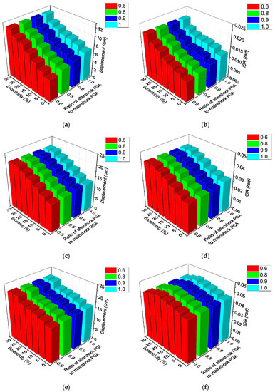 Moreover, the maximum displacements during the MSAS sequence and the mainshock are extracted. The ratios of structural maximum displacement during the MSAS sequence to that during the mainshock are presented in Figure 14a,c,e, corresponding to the mainshock PGAs which are 0.15 g, 0.25 g, and 0.32 g, respectively. Similarly, Figure 14b,d,f show the ratios of structural IDR during MSAS sequences to that during the mainshock when the mainshock PGAs are 0.15 g, 0.25 g, and 0.32 g, respectively.