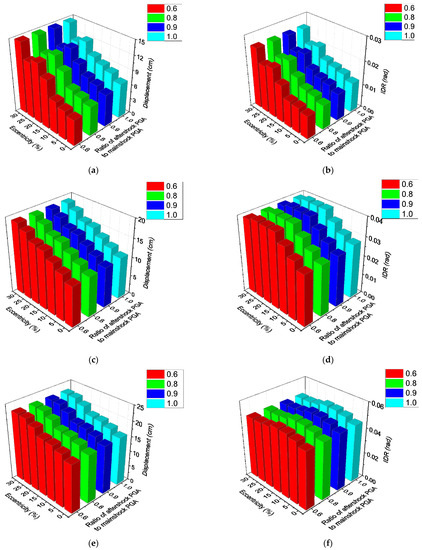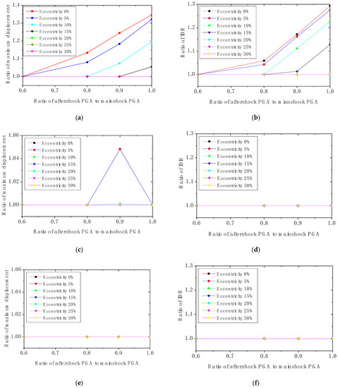 As illustrated in Figure 20b,d,f, with an improvement in eccentricity, the IDR increases obviously and uniformly at eccentricities of 0~15%, increases slowly at eccentricities of 1~25%, and decreases at the stage of 25~30%. The influence of aftershocks on IDR is only reflected in the structures with an eccentricity of 0% and 5%, which is similar to the maximum displacement response. Figure 21b,d,f also show that when the mainshock PGA is 0.15 g, the aftershock IDR can reach up to 1.4 times that of the mainshock. However, the aftershock IDR is about 1.06 times the mainshock IDR in the case of a mainshock PGA of 0.25 g, and equal to zero time in the case of a mainshock PGA of 0.32 g.
