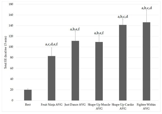 The total amount of energy expenditure (kcal) for 15 min of each experimental condition. AVG: active video game; a p ≤ 0.01: significantly different from rest condition; b p < 0.05: significantly different from Fruit Ninja AVG; c p < 0.05: significantly different from Just Dance AVG; d p < 0.05: significantly different from the Shape Up Muscle AVG; e p < 0.05: significantly different from the Shape Up Cardio AVG. f p < 0.05: significantly different from the Fighter Within AVG.