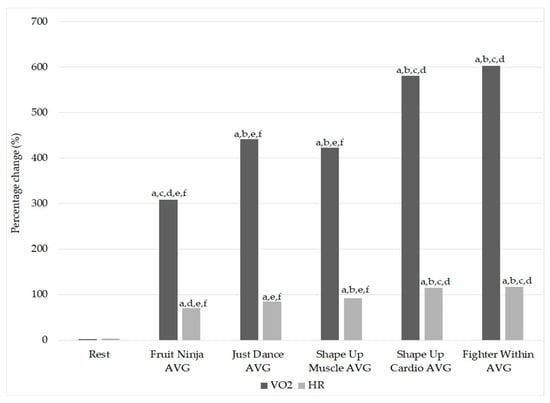 Percentage changes of VO2 and HR according to resting values. AVG: active video game; VO2: oxygen consumption; HR: heart rate; a p ≤ 0.01: significantly different from rest condition; b p < 0.05: significantly different from Fruit Ninja AVG; c p < 0.05: significantly different from Just Dance AVG; d p < 0.05: significantly different from the Shape Up Muscle AVG; e p < 0.05: significantly different from the Shape Up Cardio AVG. f p < 0.05: significantly different from the Fighter Within AVG.