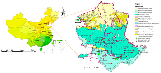 In the investigation of groundwater dynamics, a total of 75 government-monitored wells with long-term observation data were carefully selected to ensure completeness, control, and representativeness. For each district or county level, 1–2 monitoring wells were chosen for analysis, ensuring a uniform distribution across the study area. Specifically, this study focused on analyzing the response of unconfined groundwater, directly recharged by precipitation. Based on these principles, data from 24 monitoring wells were ultimately determined. To complement this analysis, three precipitation stations in Zunhua, Tangshan, and Leting were selected to match similar monitoring wells based on their proximity.