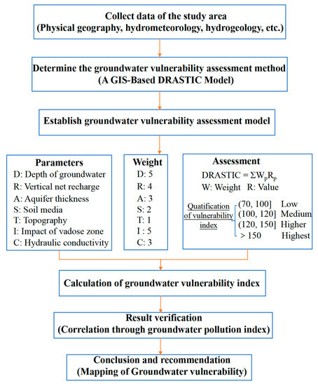The DRASTIC model aims to use seven factors such as “Depth to water, Net recharge, Aquifer media, Soil media, Topography, Impact of vadose zone, and Hydraulic Conductivity”, and allocates the ratings to all factors according to the range of factors [27], which is simple and widely used in evaluating groundwater contamination vulnerability. However, previous studies tend to assess groundwater vulnerability subjectively and refer only to a small number of factors, or have reported only a weak correlation between water pollutant concentrations (commonly nitrate) and the calculated DRASTIC index [28,29], which provided difficulties in obtaining conclusion accurately. This research integrated DRASTIC with additional methods like the GIS techniques, PCA (Principal Component Analysis), and other statistical approaches, which improve the evaluation systems to be modified to obtain more accurate results based on local hydrogeological conditions [30,31,32]. Furthermore, regression analysis is also applied in the DRASTIC model which has developed a new system for evaluating groundwater vulnerability, thereby enhancing scientific rigor and accuracy in utilization.