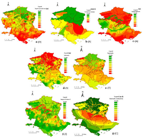 where, the parameters in Equation (1) include the following: depth of groundwater (D), vertical net recharge of groundwater (R), aquifer thickness of media (A), soil media (S), topography (T), impact of vadose zone (I), and hydraulic conductivity (C).