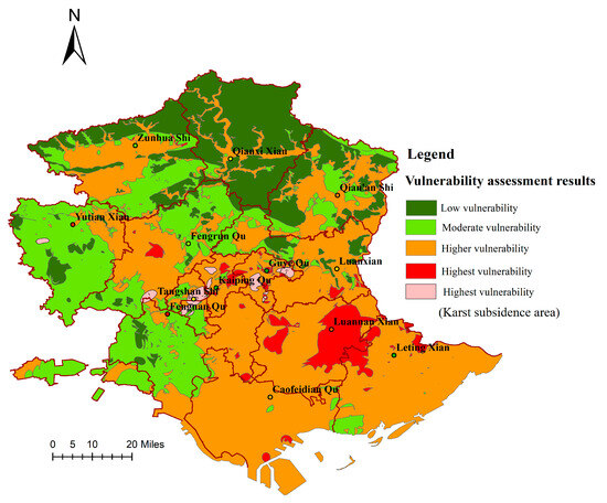 Secondly, the spatial variability and causes of groundwater vulnerability in the study area are complex. The area around Luannan County has relatively shallow groundwater depth, significant vertical recharge, and a thick aquifer, leading to its classification as an area with high underground vulnerability. The valley area in the study region is also classified as a high vulnerability area due to its homogeneous lithology, simple rock structure, and strong permeability. These areas experience frequent agricultural activities and have well-developed aquaculture, resulting in a high pollution load and easy pollution of groundwater [46]. Similarly, highly vulnerable areas are also found in the central and southeastern regions of Tangshan, characterized by high vertical net recharge, relatively high permeability coefficients, good water permeability, and limited self-purification capacity. In addition, the karst subsidence area and the mined-out coastal area were directly classified as the highest vulnerable areas, covering 1.463 km2. These factors contribute to weak anti-pollution capabilities of groundwater, making it prone to pollution. Additionally, these areas are marked by intense human activities, including urban industrial and domestic sewage discharge from Tangshan City, as well as excessive fertilization and sewage irrigation in agricultural regions. Therefore, they should be prioritized as key areas for groundwater protection.