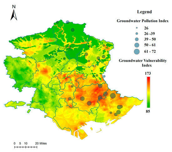 We selected 11 water quality indicators (in Table 4) from nearly 30 well sites to calculate the Groundwater Pollution Index (GPI), which summed every index up after assigned number based on different categorization criteria in Table 4. The GPIs, ranging from 26 to 72, were used to validate the groundwater vulnerability and mapped in Figure 5, which demonstrates that high groundwater vulnerability corresponded to a high groundwater pollution index. These two were in high agreement, with a R2 coefficient of 0.961, as shown in Figure 6. This certificated that the GIS-based DRASTIC model for groundwater vulnerability assessment was scientific and reliable, and could provide reliable experience for groundwater pollution prevention and management.