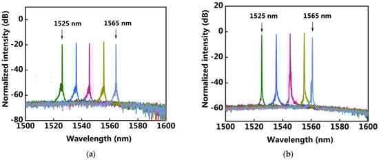 Optical spectra of the output beam for the ECDLs with (a) an injection current of 150 mA and (b) an injection current of 200 mA. The tunable range is both 40 nm from 1525 nm to 1565 nm. The peaks in the tuning range correspond to different grating positions.