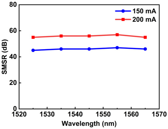 To characterize the relationship between the SMSR and injection current, the SMSRs of the ECDL system at a function of different wavelengths are measured at injection currents of 150 nm and 200 nm, respectively. The statistical result is illustrated in Figure 6. It can be seen from Figure 6 that the tunable range is basically unchanged as the current increases. This is because the bandwidth of interference filter is 40 nm. Additionally, under the low current condition of 150 mA, it still has a relatively high gain in the tunable band of 1525 nm to 1565 nm. As shown in Figure 6, the SMSR is increased significantly when the injection current increases from 150 mA to 200 mA. The maximum SMSR is 47 dB at an injection current of 150 mA. Additionally, the maximum SMSR reaches 57 dB at the wavelength of 1555 nm with an injection current of 200 mA. Furthermore, the gain of the external cavity laser within the passband of interference is relatively high when the injection current is higher than 150 mA, and the SMSR changes gently throughout the tuning range when the injection current is higher than 150 mA.