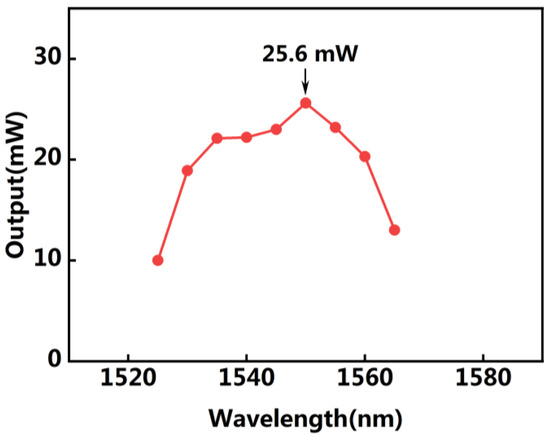 The output power is dependent on the combined result of optical gain and intra-cavity loss. On the one hand, optical gain and loss are related to the structure of the gain chip. On the other hand, from Formulas (4) and (5), they are related to the efficiency of optical elements in the external cavity. In our experiment, a relatively high output power is obtained. The output power is measured as a function of wavelength under an injection current of 200 mA, as shown in Figure 7. Over the tunable range of wavelength, the optical gain is different for different output wavelengths. Therefore, the power varies with wavelength. As shown in Figure 7, the power in the middle part is higher and the power on both sides is lower. The maximum output power is 25.6 mW at a wavelength of 1550 nm. The gain loss of the wide bandpass filter is relatively small, and it has high output power at a low current condition. If the injection current is enhanced, it would obtain higher output power.