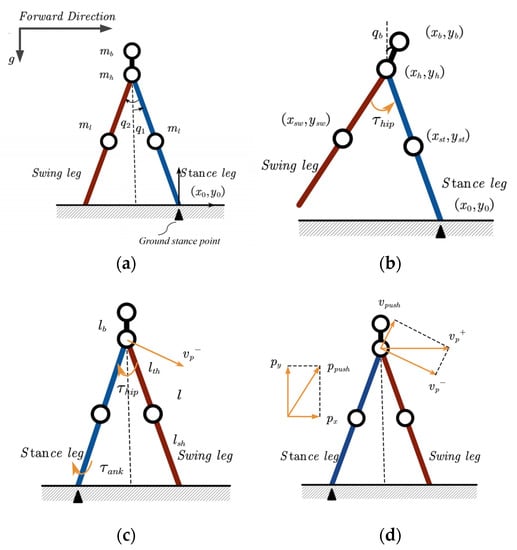 A standard walking model step includes (a) initial parameters, (b) swing phase, (c) immediate push-off, and (d) immediate heel-strike.