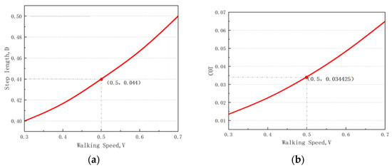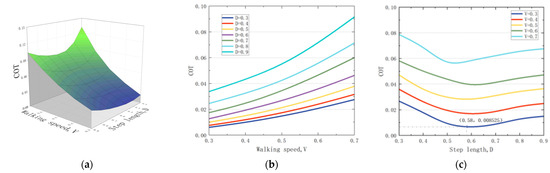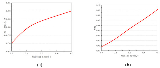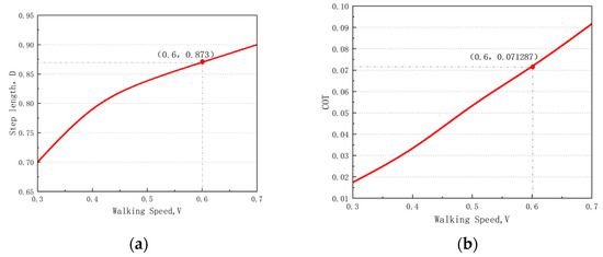 As shown in Figure 12, the variation in the optimal step length and the corresponding optimal are depicted when is fixed at 0.3. At different walking speeds, it is possible to find the corresponding step length that minimizes the (V = 0.6, D = 0.873, and = 0.071287).