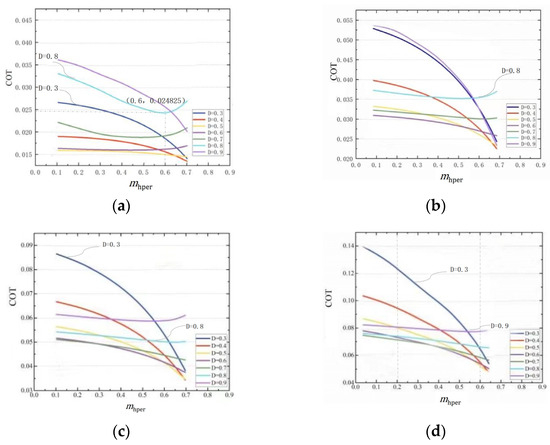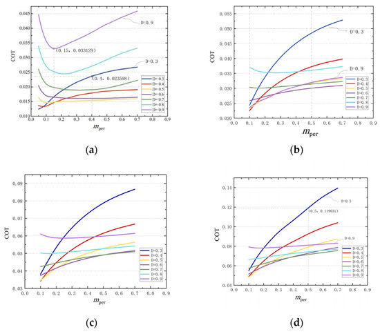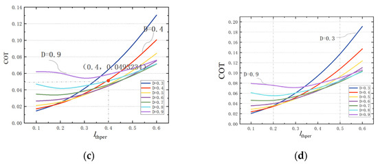 As shown in Figure 11, the energy consumption corresponding to different step lengths is depicted for the range of V = {0.3, 0.4, 0.5, 0.6}, with respect to the variation in . The increases with an increase in when the walking speed remains constant and the step length is short (Figure 11c: V = 0.5 and D = 0.4). At longer step lengths, the first decreases and then increases with an increase in , and the overall trend changes steadily. In Figure 11a, when V = 0.3 and D = 0.8, the minimum energy consumption value is 0.024812 for = 0.3.