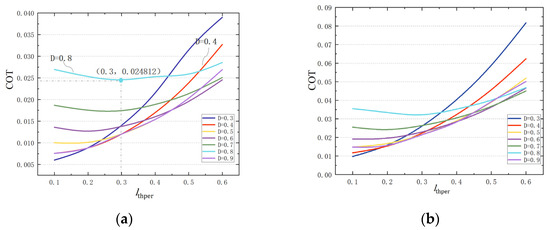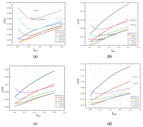 Figure 14 shows that when V = {0.3, 0.4, 0.5, 0.6}, the corresponding to the different step lengths changes with . When the walking speed is fixed and the step length is short, the energy consumption increases with an increase in . At long step length, the energy consumption first decreases and then increases with an increase in (Figure 14b: V = 0.4 and D = 0.4, 0.8).