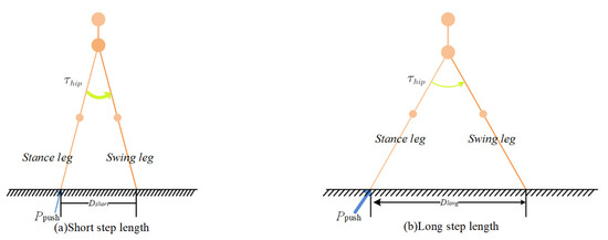In this model, the hip joint torque serves as the primary driving force during the swing phase, and it only exists at the beginning of the gait. On the other hand, in the push-off phase, ankle joint torque is the sole driving force in this model, and it only exists when the gait is about to end. Figure 18 shows that when walking with a short step length, a smaller push-off impulse is adequate to successfully complete the swing of the stance leg. The duration of the swing phase is relatively short, so the swing leg needs to generate a larger torque by the hip to complete the swing quickly. As the step length increases, a larger push-off impulse is necessary to enable the swing of the stance leg during the swing phase. At this point, the duration of the swing phase increases, and the swing leg only needs a smaller torque to complete the swing. At the same walking speed, for longer step lengths, the required hip joint torque is smaller, and the push-off impulse is larger during the swing phase. By comparing with the former study, the above common features can be identified [36,37].