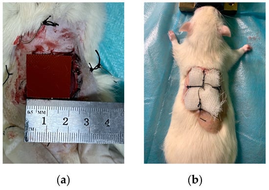 The next step was applying the “levomekol” preparation (for animals in the 2nd and 3rd groups) and imposing sterile gauze bandages (for animals in all groups). The bandage was affixed using preattached hooks and loops (Figure 4b). To ensure the possibility of atraumatic removal and replacement of dressings and—given the impossibility of their standard fixation via dressing because of the behavioral characteristics of rats—two mutually perpendicular hook–loop pairs were additionally prepared on the backs of the animals, sutured directly to the intact skin.